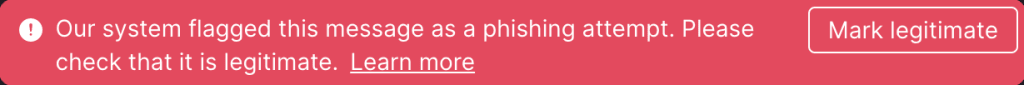 If you’re using Proton Mail, you’re automatically protected from phishing scams with PhishGuard, a set of advanced technologies specifically designed to combat phishing. If a phishing email lands in your Proton Mail inbox, you’ll see a red warning label at the top: