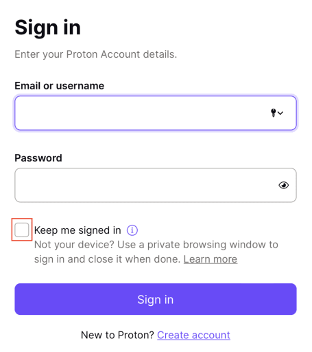 We also strongly recommend using the private browsing mode (also known as incognito mode) to sign into your Proton Mail account. Select the Keep me signed in checkbox only if you’re using your personal device that nobody else has access to.