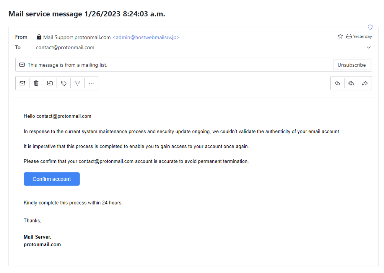 Si vous avez dit que c’était une attaque de phishing, vous avez raison. Les attaquants tentent souvent de se faire passer pour Proton Mail, sachant que les gens nous font confiance pour protéger leurs informations personnelles. Le premier indice est le champ De . Bien que cet e-mail prétende provenir de Mail Support protonmail.com, si vous regardez l’adresse e-mail qui suit, elle n’utilise pas un domaine Proton Mail reconnu (celui-ci utilise un domaine @hostwebmailsrv.jp). Il ne comporte pas non plus notre badge Officiel (qui est la manière dont nous vérifions la légitimité des e-mails Proton Mail).