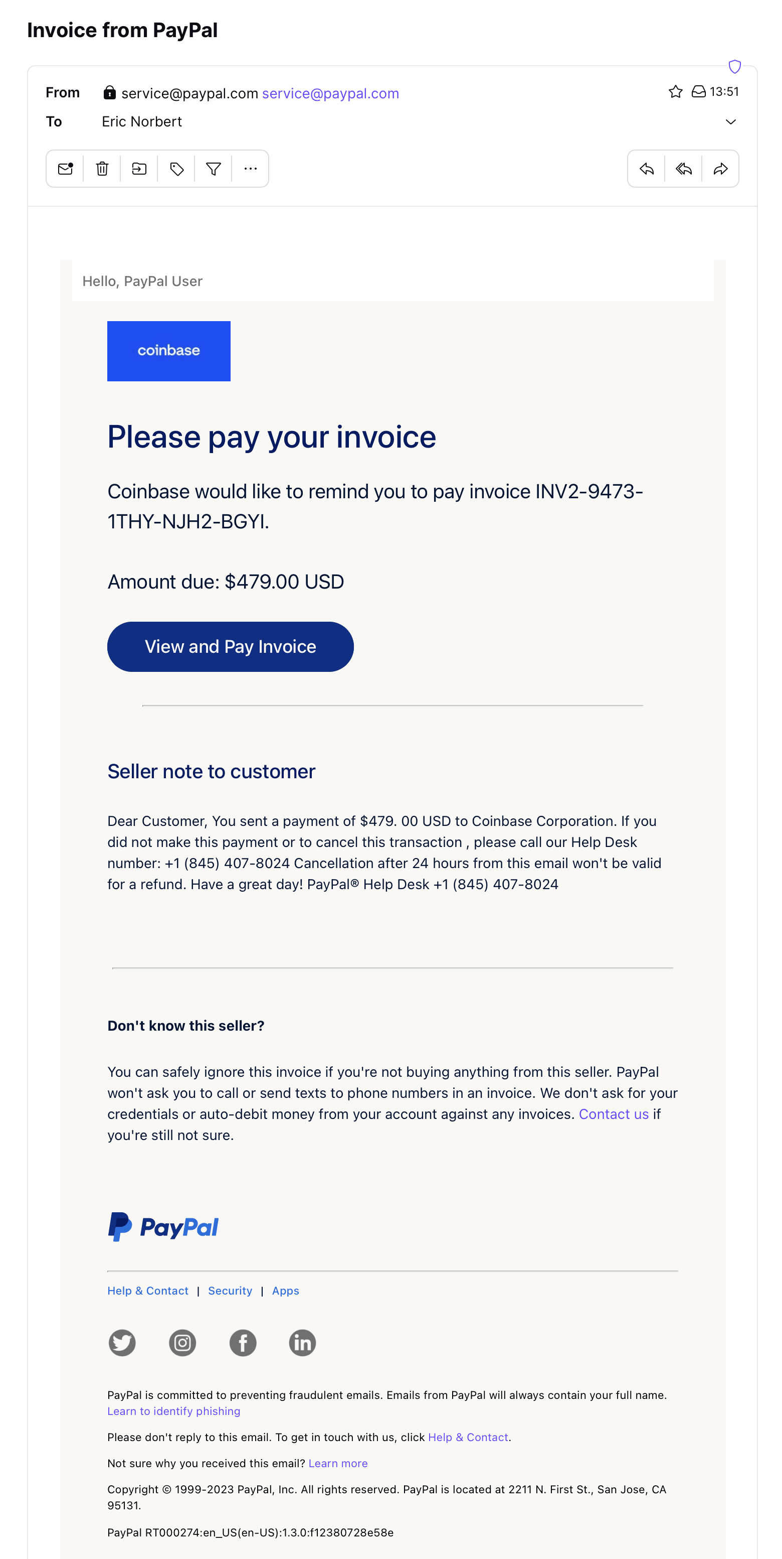 Les attaquants espèrent que vous appellerez le numéro de téléphone indiqué dans l’e-mail pour contester ou annuler le paiement. Ce numéro n’appartient pas à PayPal. Au lieu d’appeler le service client de PayPal, vous appelez en réalité l’attaquant se faisant passer pour le service client.