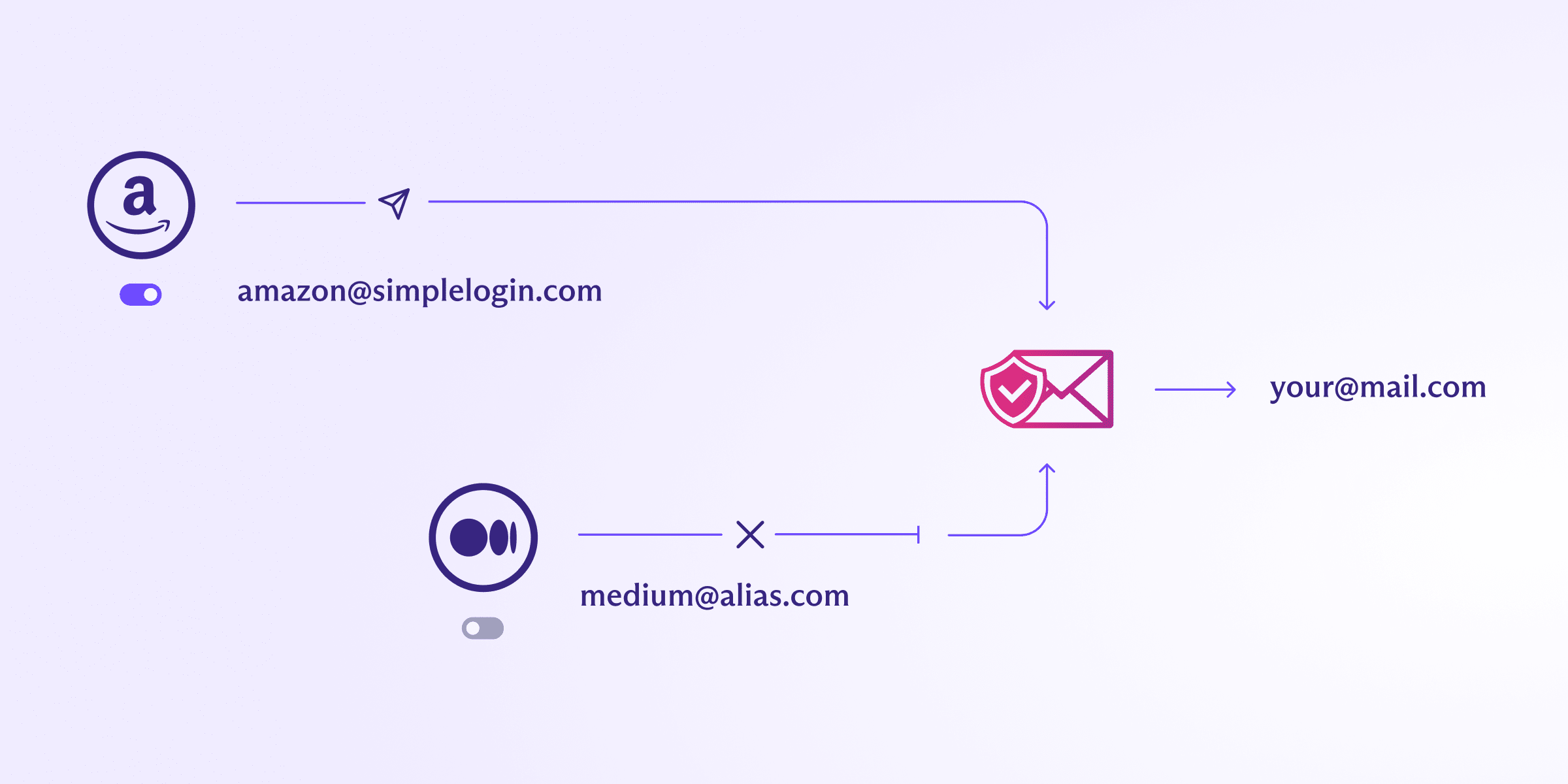 Par exemple, imaginez que vous vous inscrivez sur un site internet en utilisant un alias (website1@yourname.simplelogin.com) et puis que ce site internet envoie un e-mail à votre véritable adresse e-mail (realemail@protonmail.com). Dans ce cas, vous pouvez supposer qu’il est probablement pas un e-mail légitime, car le site internet réel n’avait pas accès à votre véritable adresse e-mail lors de votre inscription.