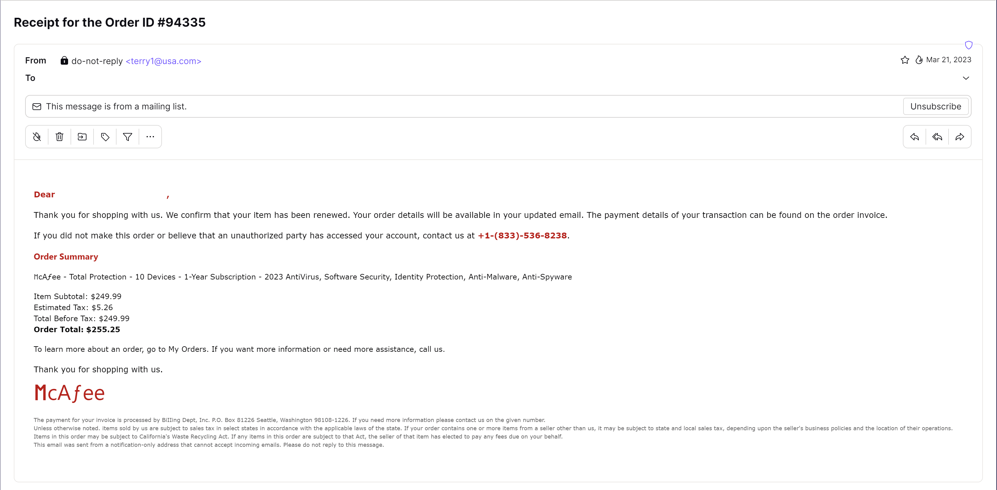 Si vous avez identifié cela comme une attaque de phishing, vous avez raison. Cet exemple contient de nombreux signaux d’alerte, tels que l’adresse e-mail dans le champ De (il semble peu probable que McAfee utilise un domaine @usa.com) et le logo McAfee clairement incorrect en bas de page.