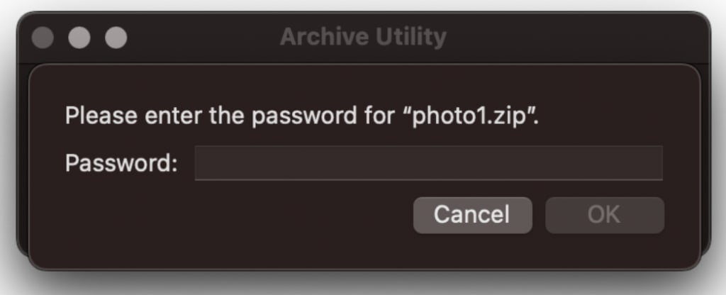 Votre Mac créera un fichier zip. Quand vous essayez de l’ouvrir, vous êtes invité à saisir votre mot de passe.