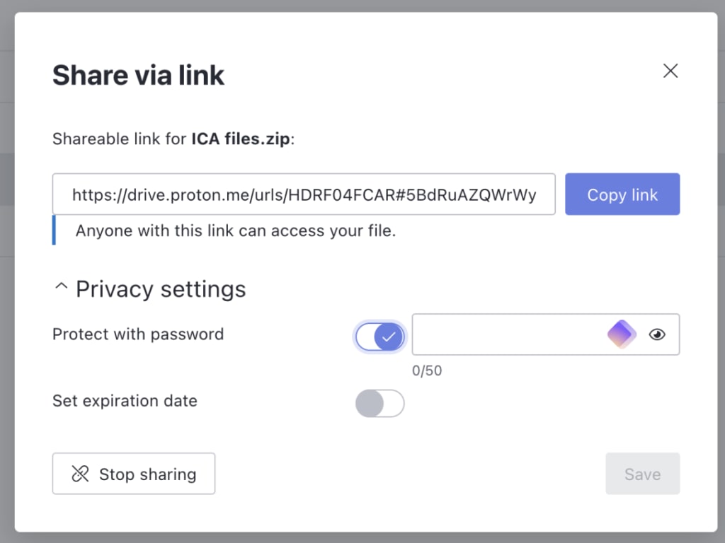 De plus, vous n’aurez peut-être même pas besoin de compresser vos fichiers puisque Proton Drive vous permet d’enregistrer et de partager gratuitement des fichiers volumineux.