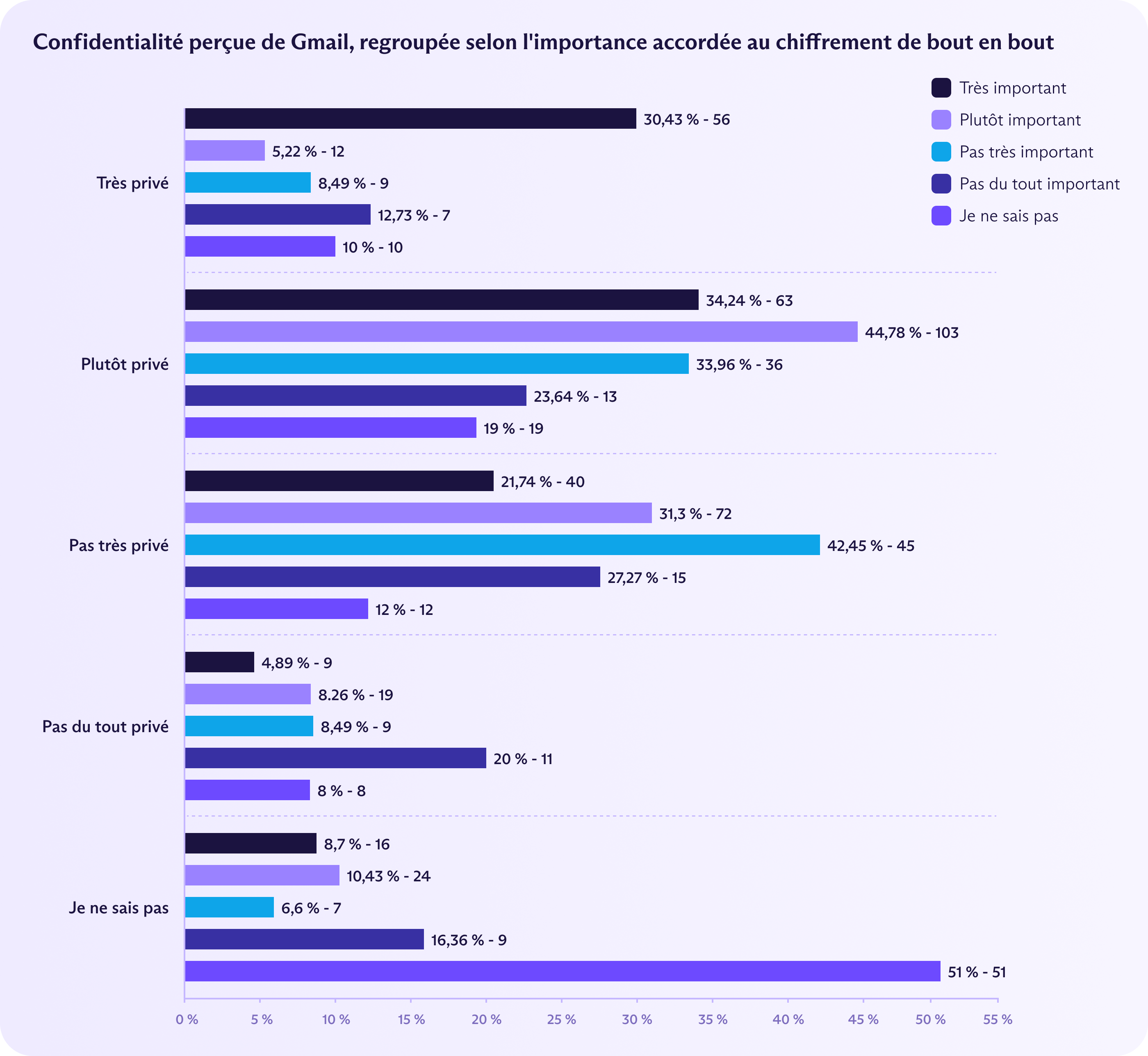 Les personnes qui considèrent l'E2EE comme très important étaient en réalité plus nombreuses à affirmer que Gmail utilisait l'E2EE que la moyenne des participants à notre enquête (35 % contre 22 %). Ce même groupe était également plus enclin à considérer Gmail comme un service privé : 30 % l'ont qualifié de « très privé » et 34 % supplémentaire le qualifiant de « relativement privé ».