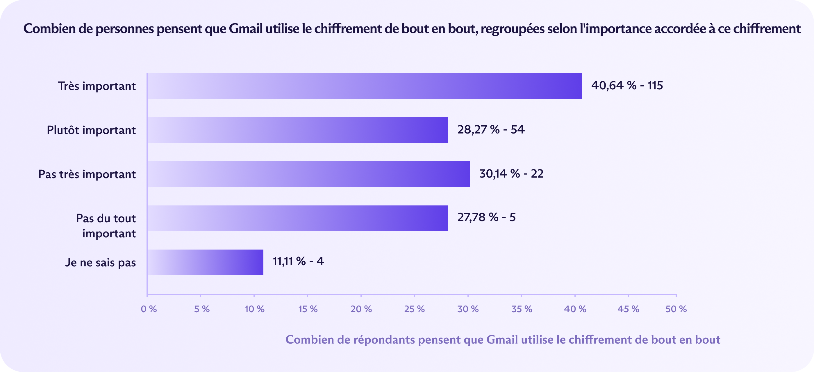 Google a grandement bénéficié des idées fausses du public sur la sécurité et le respect de la vie privée. Les personnes qui considèrent l'E2EE comme très important étaient en fait plus susceptibles de dire que Gmail utilisait l'E2EE que la personne moyenne de notre enquête (45 % contre 33 %). Ce même groupe était également plus enclin à considérer Gmail comme un service privé : 30 % l'ont qualifié de « très privé » et 34 % supplémentaire le qualifiant de « relativement privé ».