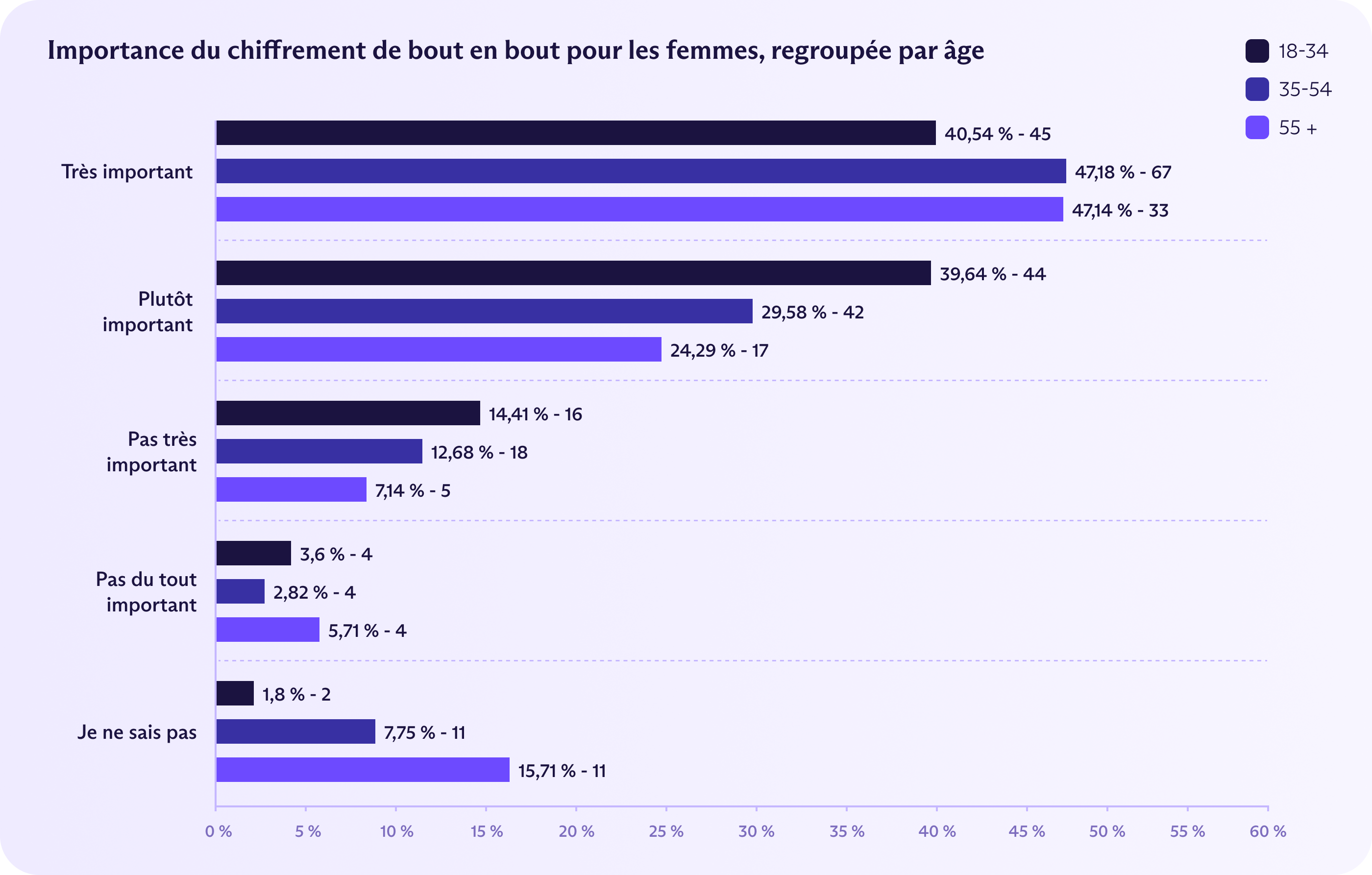 Cependant, 47 % des femmes âgées de 35 à 54 ans et des femmes de plus de 55 ans ont déclaré que l'E2EE était important, bien plus que les hommes de plus de 55 ans (37 %) ou les femmes de moins de 34 ans (41 %).