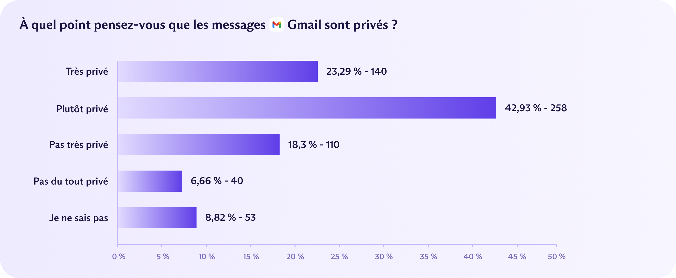 En fait, les Allemands étaient les plus à l'aise avec les protections du respect de la vie privée de Gmail. Dans l'ensemble, 66 % des Allemands pensent que leurs messages Gmail sont « très » ou « assez privés », le niveau de confiance le plus élevé parmi les pays étudiés, suivis par les États-Unis à 61 % et le Royaume-Uni à 57 %. Ironiquement, le pays qui accorde le moins de confiance à l'E2EE, la France, a également le moins de confiance en Gmail, avec seulement 48 % des répondants français déclarant que leurs messages étaient au moins assez privés.