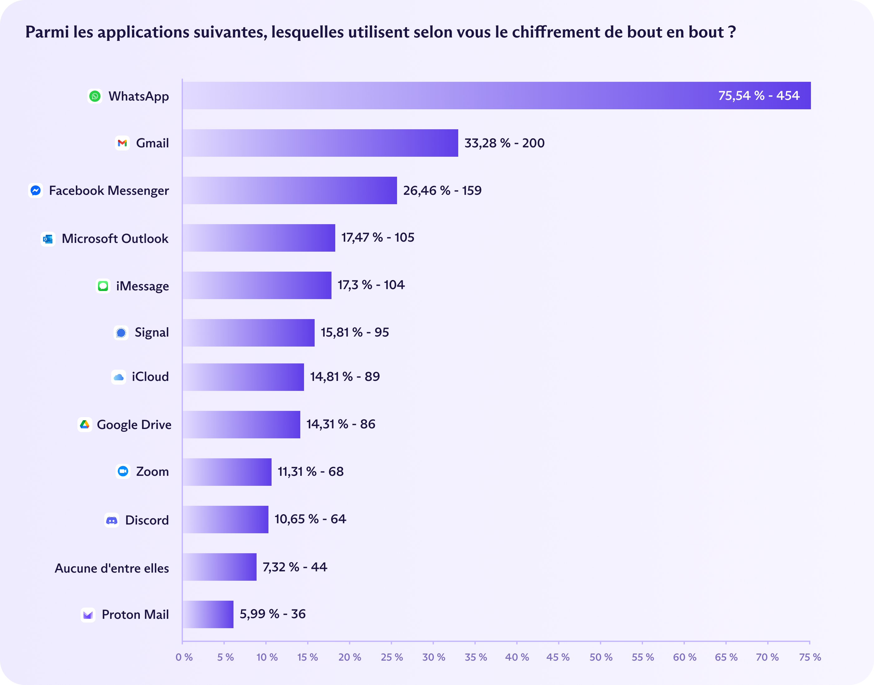 Parmi toutes les applications sur lesquelles nous avons posé des questions, WhatsApp se démarque. Le service a longtemps fait de l'E2EE un élément central de son marketing, ce qui explique peut-être pourquoi trois Allemands sur quatre (75 %) savent correctement qu'il propose cette technologie, le seul service E2EE correctement identifié par une majorité de répondants. C'est aussi le plus utilisé, 82 % des répondants déclarant avoir utilisé WhatsApp au cours des 30 derniers jours.