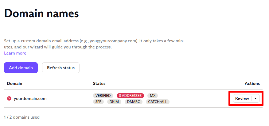 To do this, you must have a paid Proton Mail plan. The number of custom domains you can use with Proton Mail depends on your plan.