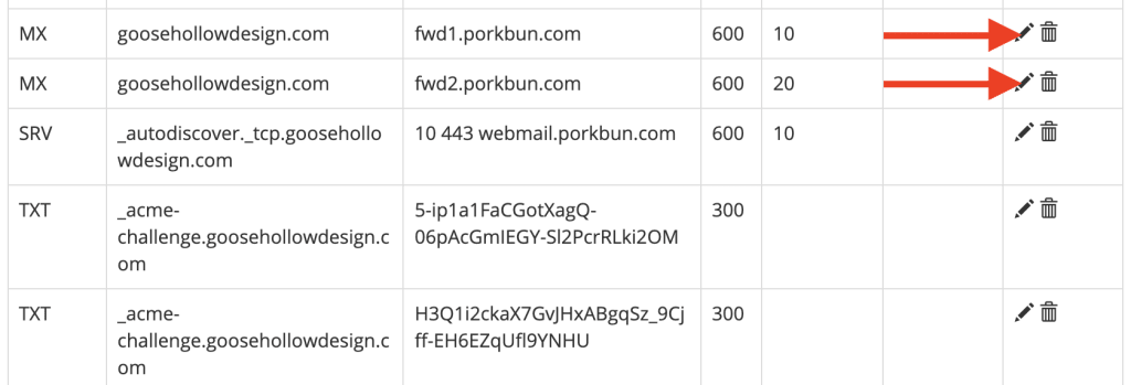 - Go to the Porkbun page, scroll down, and delete any existing MX records by clicking trashcan (🗑️).