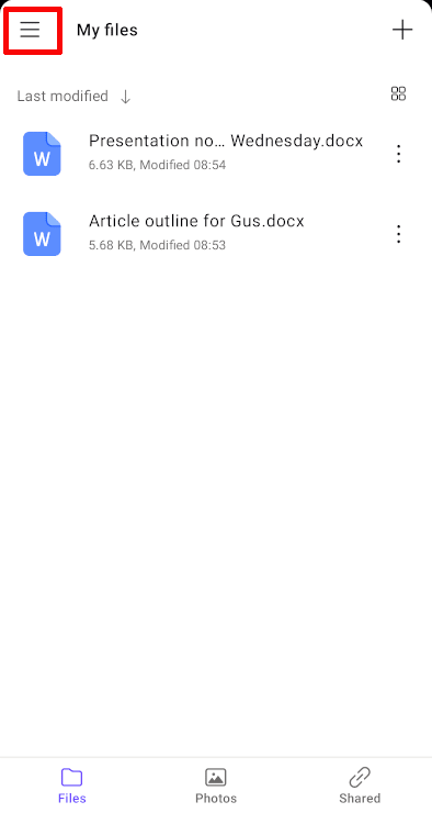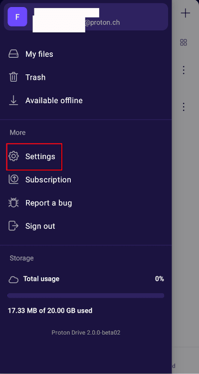 - Open the Proton Drive app. Tap the menu button (≡) in the top left corner.