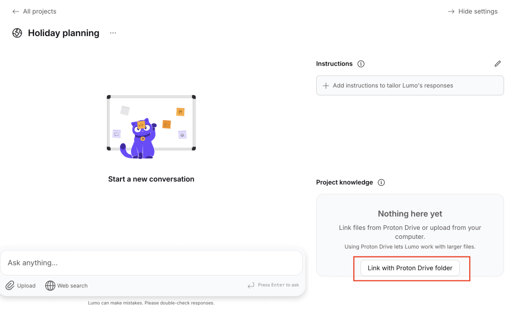 - Be specific. Project instructions should clearly explain what you’re trying to achieve and how you want Lumo to help. Include details such as the type of output you want, your preferred style, or key focus areas. You can also get Lumo to adopt a particular personality to shape how it responds, such as that of a personal fitness assistant or a brainstorm partner.