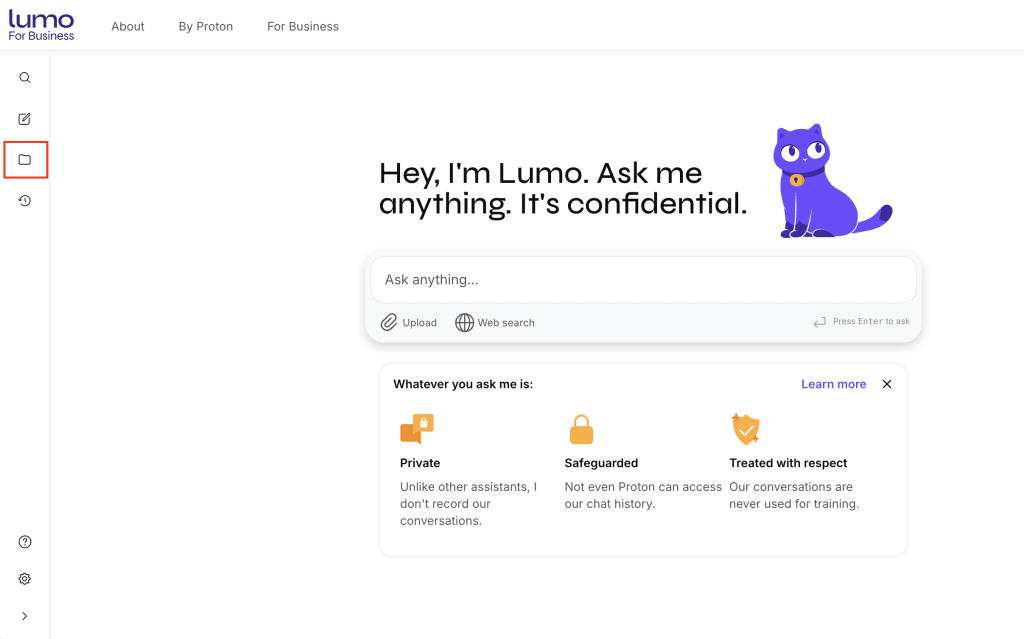 - Sign in at lumo.proton.me(nouvelle fenêtre), then select the folder icon in the left bar.