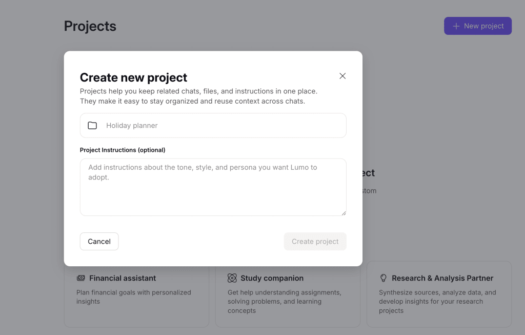 Clear, focused instructions help Lumo better understand your workflow and respond in a way that’s consistent with your goals. Here are some tips for getting the best results with Projects: