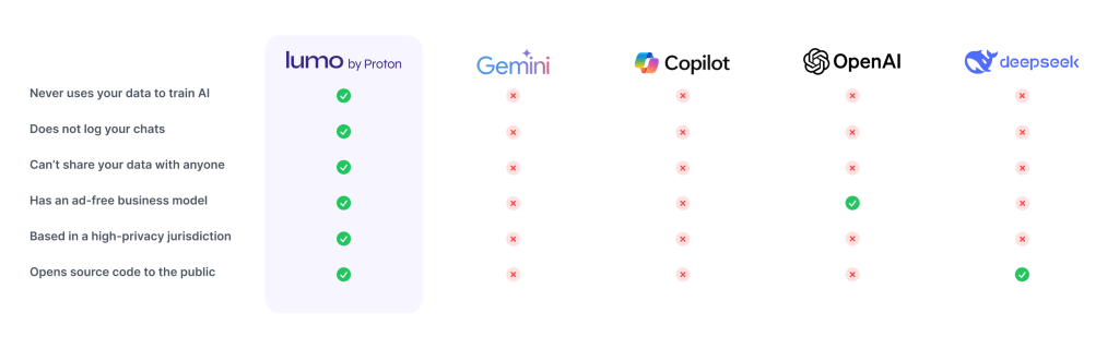 Como todos os serviços Proton, o Lumo foi construído em torno da privacidade, segurança e transparência. Em contraste com outras empresas que trabalham com IA, a Proton não ganha dinheiro vendendo seus dados. Somos apoiados exclusivamente por nossa comunidade, não por anunciantes, e nossa base na Europa, amiga da privacidade, nos dá as proteções legais para garantir que possamos cumprir nossas promessas. Mais importante, pertencemos à organização sem fins lucrativos Proton Foundation, cuja única missão é promover a privacidade e a liberdade.
