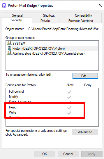 2. Select your Windows username and ensure you have both Read and Write permissions. (This means that there’s a check mark next to them in the Allow column, and the Deny column is empty.)
