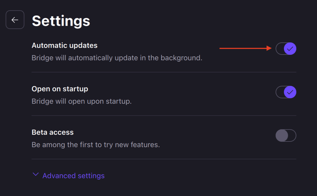 - After you have selected this option, Bridge will let you know a new update is available, but the app won’t download or install it for you. You will need to download updates yourself following the in-app instructions.