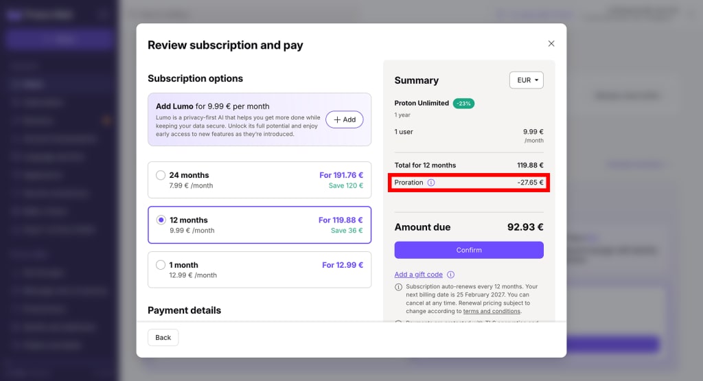 Example: You’re switching from Proton Family (1 month) to Proton Unlimited – 12 months.