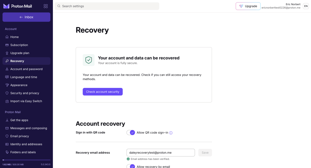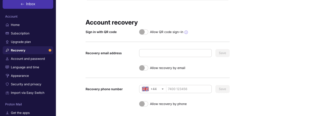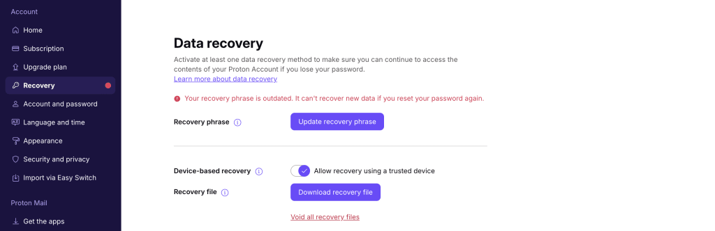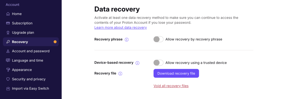 It’s extremely important to secure your Proton Account with multiple recovery methods. If you lose your password without having a recovery method set up, you risk permanently losing access to your account and data.